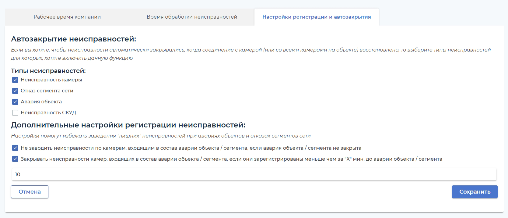 Доступна настройка автоматического закрытия неисправностей при восстановлении соединения с камерами.