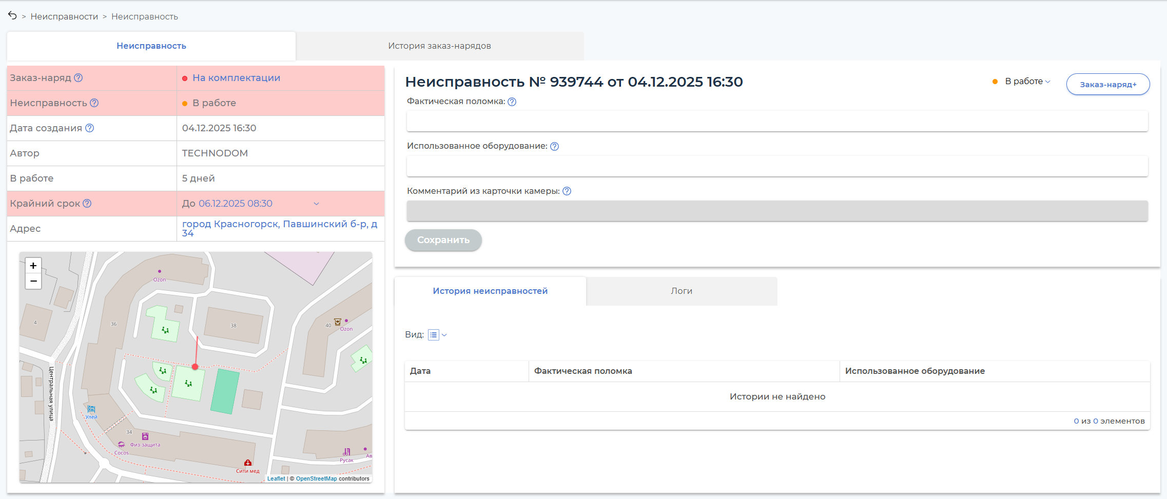 Срок обработки неисправности (по каждому статусу) рассчитывается на основе графика работы компании и настроек приоритетов. При превышении срока неисправность получает статус «Просрочена», а строка в списке подсвечивается красным.